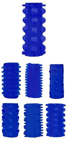 Набор из 7 синих насадок на пенис. Насадки имеют различный рельеф для более ярких ощущений.