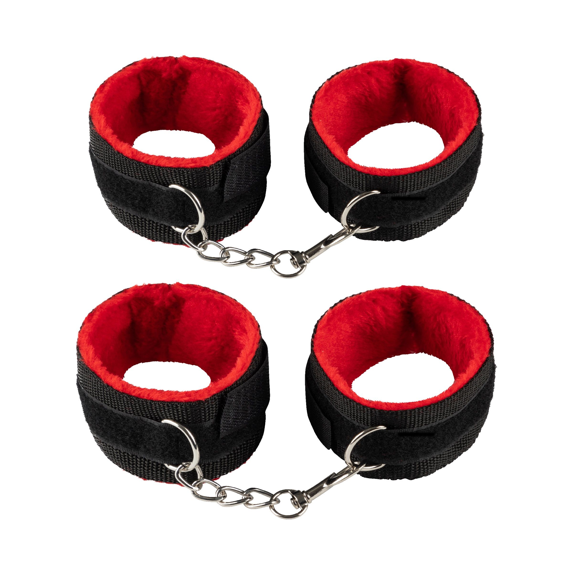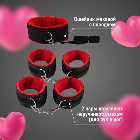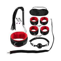 В набор входят 2 пары кожаных наручников с мехом (для рук и ног), 1 ошейник меховой с поводком, 1 кляп-шар, 1 маска для глаз, 1 плеть-флогер, 2 зажима для сосков. Итого 8 предметов для смелых экспериментов в спальне. Комплект выполнен из прочной эко-кожи практичного черного цвета с красной отделкой и совершенно неприхотлив в уходе.