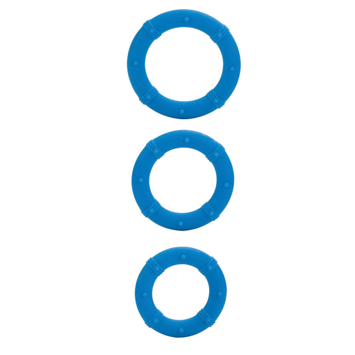 Набор из трех эрекционных колец, голубого цвета из качественного безопасного силикона. Крепкие, эластичные, универсальные кольца трех диаметров. Диаметр большого - 4,5 см.