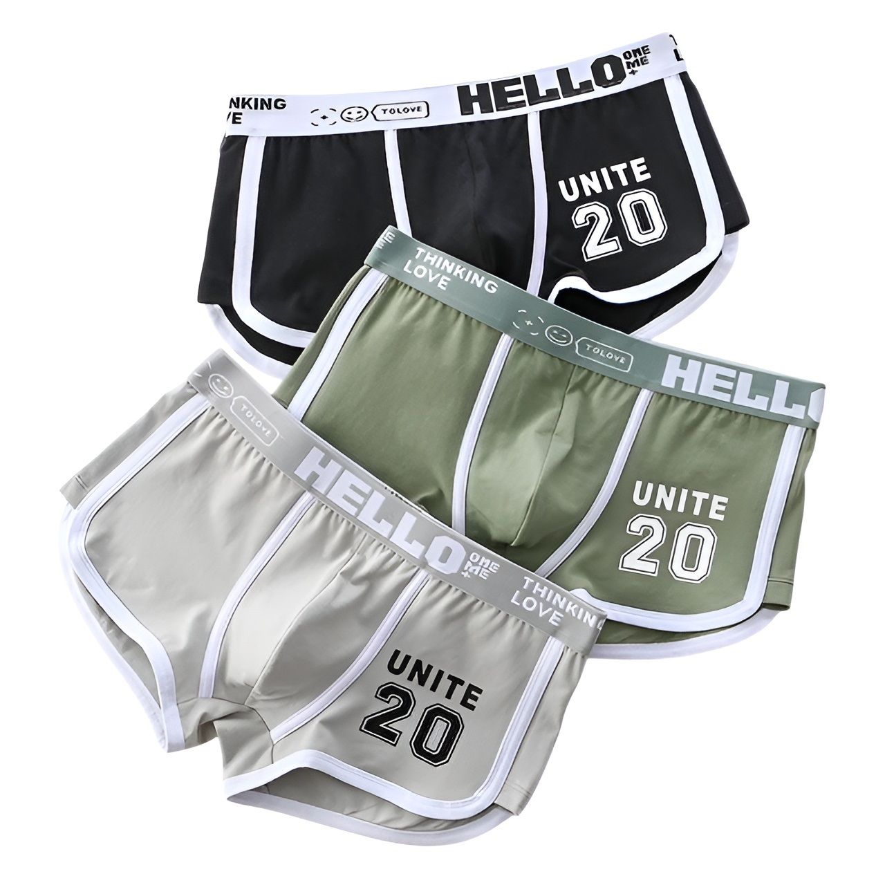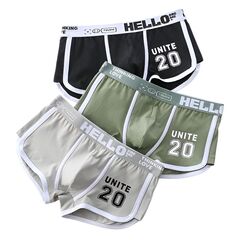 Набор из трех мужских трусов-боксеров с принтом на резинке: черных, зеленых и серых.