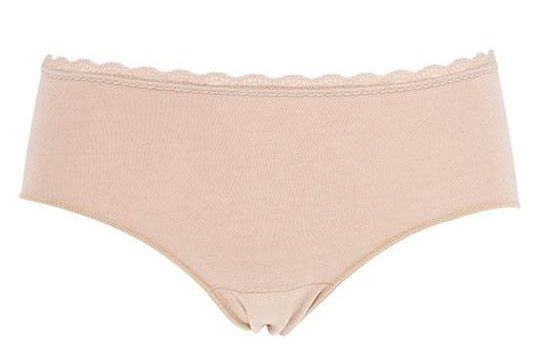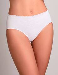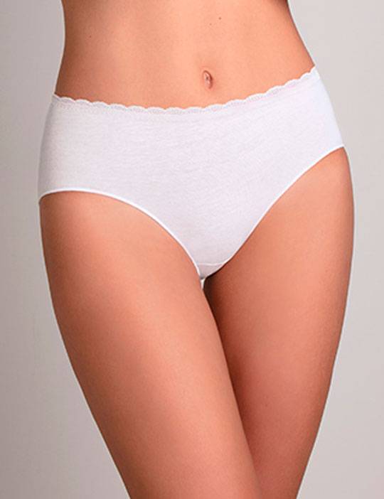 Трусики-слип из мягкого эластичного хлопка, тянущегося в 2 стороны. Линия талии обработана кружевной тесьмой шириной 1,3 см, линия открытия ноги плоским оверлоком. Высота бочка 12 см. Средняя посадка талии. Набор из 3 шт. одного цвета.