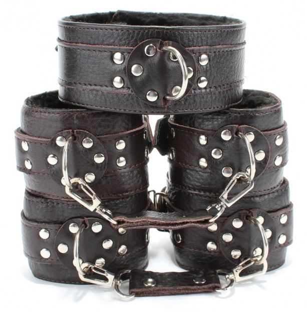Набор коричневых фиксаторов: наручники с мехом, наножники и ошейник