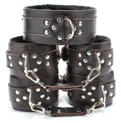 Набор состоит из наручников, оков, ошейника, выполненных из натуральной кожи темно-коричневого цвета, обратная сторона из черного эко-меха, очень приятна к телу. Аксессуары декорированы металлической фурнитурой. Все составляющие надежно фиксируются ремнями и металлическими пряжками, позволяющими выбрать нужный размер. Ошейник подойдет на обхват от 28 до 36 см, наручники подойдут на обхват руки от 15 до 23 см, оковы на обхват от 16 до 26 см. Аксессуары можно скреплять по вашему желанию кожаными соединениями на карабинах. Не ограничивай себя во власти! Длина соединений - 14 см.