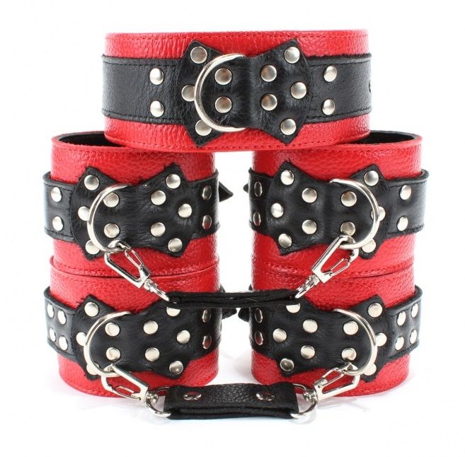 Набор состоит из наручников, оков, ошейника, выполненных из натуральной кожи красного цвета со вставками из черной кожи. Декор в виде банта с металлическим кольцом по центру на каждом изделии придает пикантности для самых смелых фантазий. Все составляющие надежно фиксируются ремнями и металлическими пряжками, позволяющими выбрать нужный размер. Ошейник подойдет на обхват от 29 до 39 см, оковы на обхват от 16 до 26 см, наручники на обхват от 15 до 24 см. Атрибуты можно скреплять по вашему желанию кожаными соединениями на карабинах. Ширина манжет - 6 см.