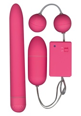 Набор из вибратора, вагинальных шариков и вибрирующего яйца с дистанционным управлением. Вибратор имеет несколько скоростей вибрации, регулируемые при помощи поворота нижней части игрушки. Виброяйцо имеет одну скорость вибрации. Батарейка для пульта входит в комплект при покупке. Вагинальные шарики имеют удобное кольцо для удерживания. Работает от батареек 2хАА и 2хААА, нет в комплекте.