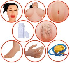 Красивая надувная кукла с очаровательным 3D лицом с открытым мягким ртом, натуральными волосами и стоячим положением. Имеет натуральные размеры, красивую, большую и упругую грудь с напряженными сосками. А так же 3D ноги и руки и 2 соблазнительных любовных отверстия (вагина и анус из кибер-кожи). Голова, руки, грудь и ноги изготовлены из очень высококачественного материала. В комплект входит насос, рем.комплект и виброяйцо.