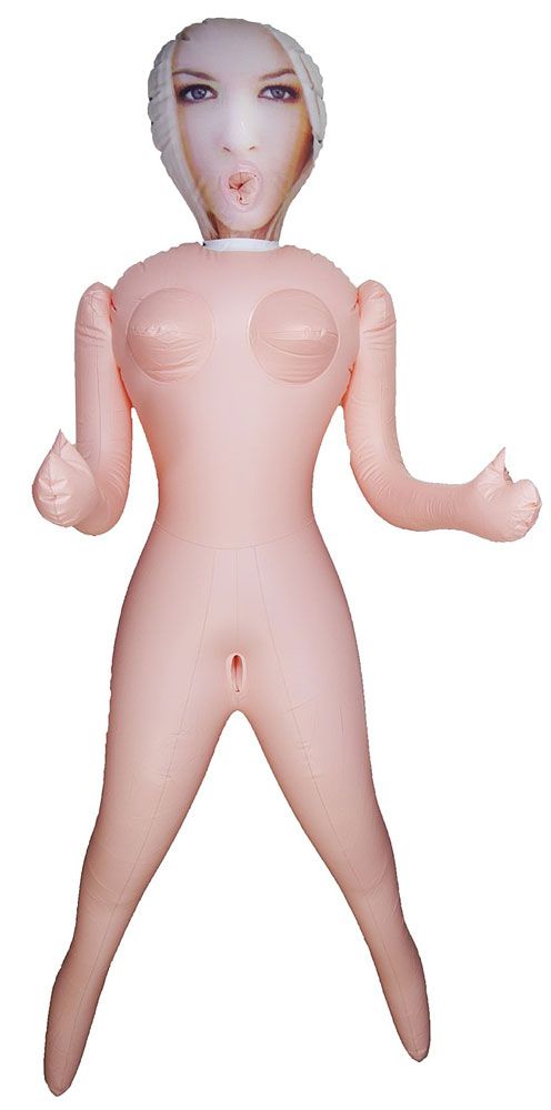 Красивая надувная кукла любви с очаровательным напечатанным лицом и стоячим положением. Она натурального размера, имеет грудь и 3 заманчивые любовные дырочки.