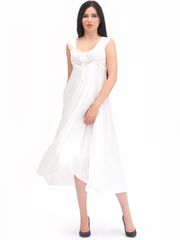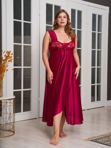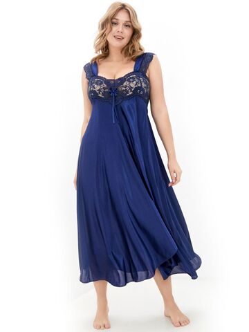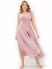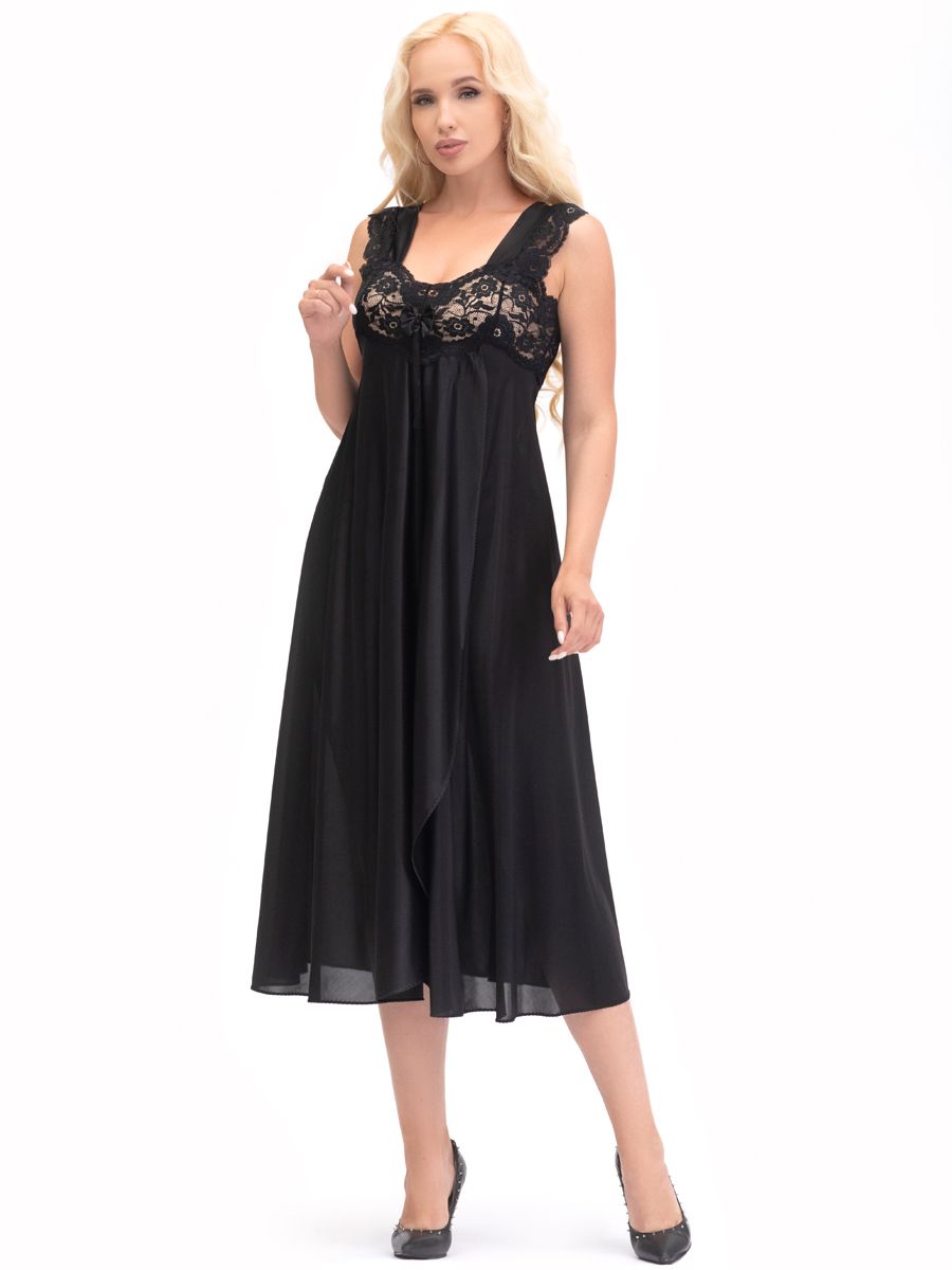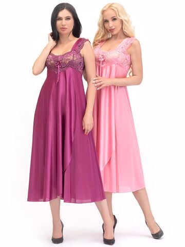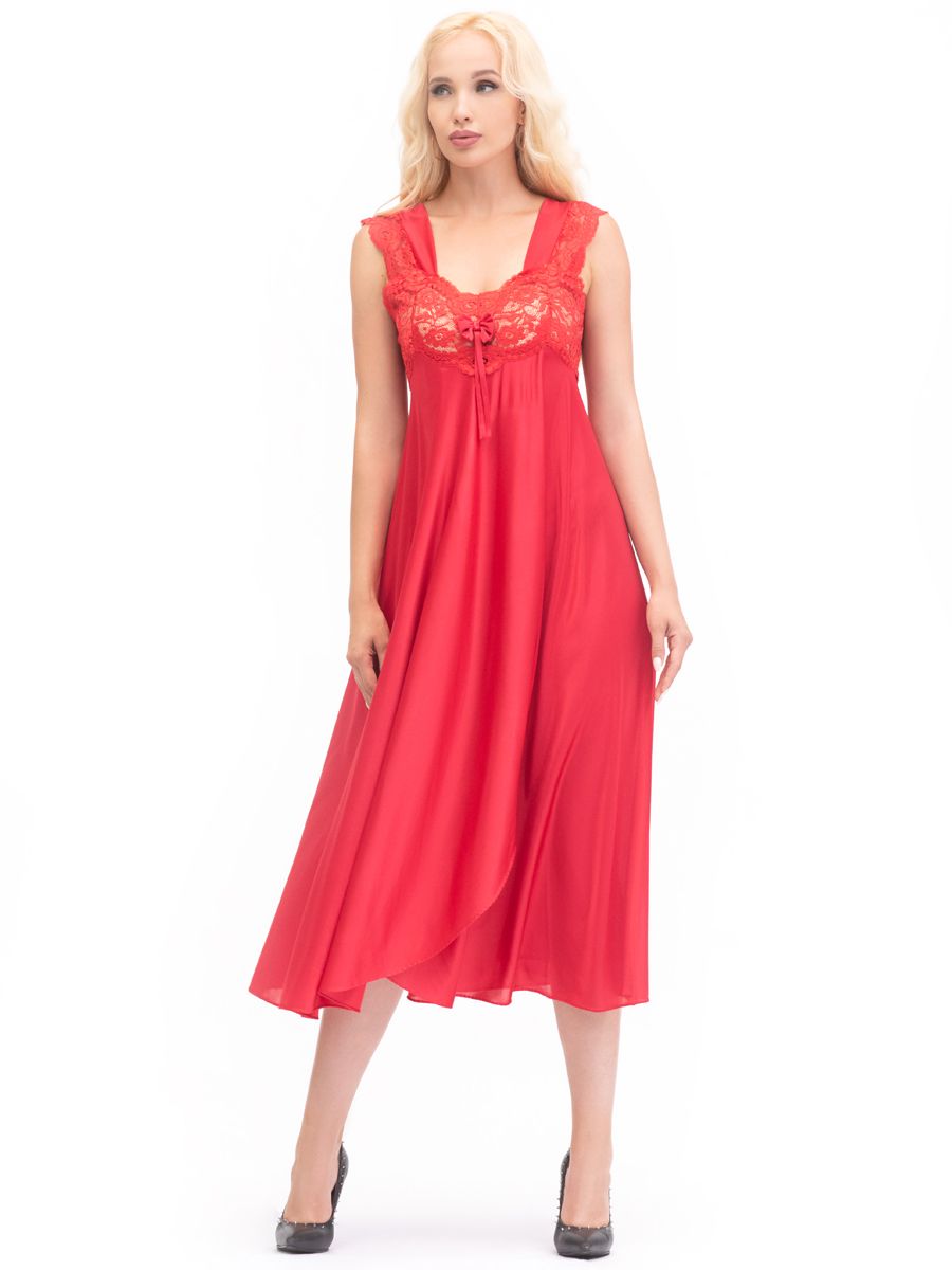 Нарядная длинная сорочка выполнена из однотонного шёлкового трикотажа, полуприлегающего силуэта, расширенная книзу, с передней деталью на запАх; широкие бретели, украшены кружевом, лиф сорочки из эластичного кружева. Декорирована бантиком на груди.