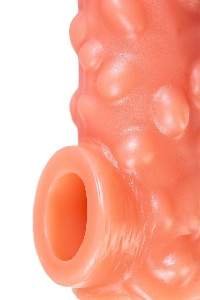 Насадка очень эластичная, имеет крупные бугорки и рельеф по всей поверхности, для стимуляции эрогенных зон партнера, увеличивает толщину головки и ствола пениса. Специальное круглое отверстие у основания позволяет надежно фиксировать насадку на члене без лишних усилий.