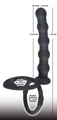 Гибкая насадка на пенис для двойного проникновения. Фиксируется на члене и мошонке при помощи колец. Позволяет ласкать вагину и анус партнёрши одновременно: вагину - собственным членом, а анус - фигурным стимулятором с пятью бусинами. Насадка выполнена из нежного, бархатистого на ощупь силикона. Длина отростка - 12,5 см., диаметр - 2,3 см.