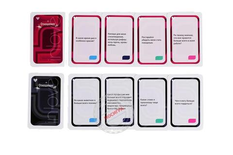 -Две колоды карт с заданиями — тёмно-синие для него и розовые для неё: 35 карт «Ощущений», 35 «Отношений» и 35 карт «Размышлений»;