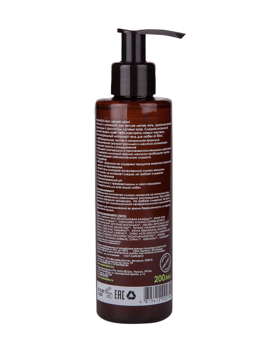 Попробуй вкус летней ночи! Манящий и нежный, как теплая летняя ночь. Дыхание свежей прохлады с ароматом луговых трав. Сладкая влажность летней зелени зовет тебя на встречу новым чувствам. Это натуральный лубрикант для любви от Ёska.