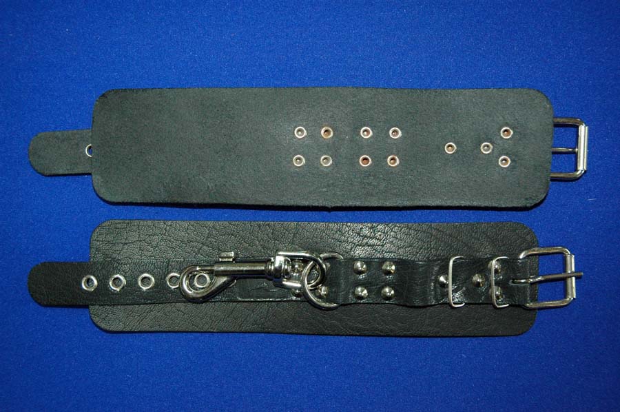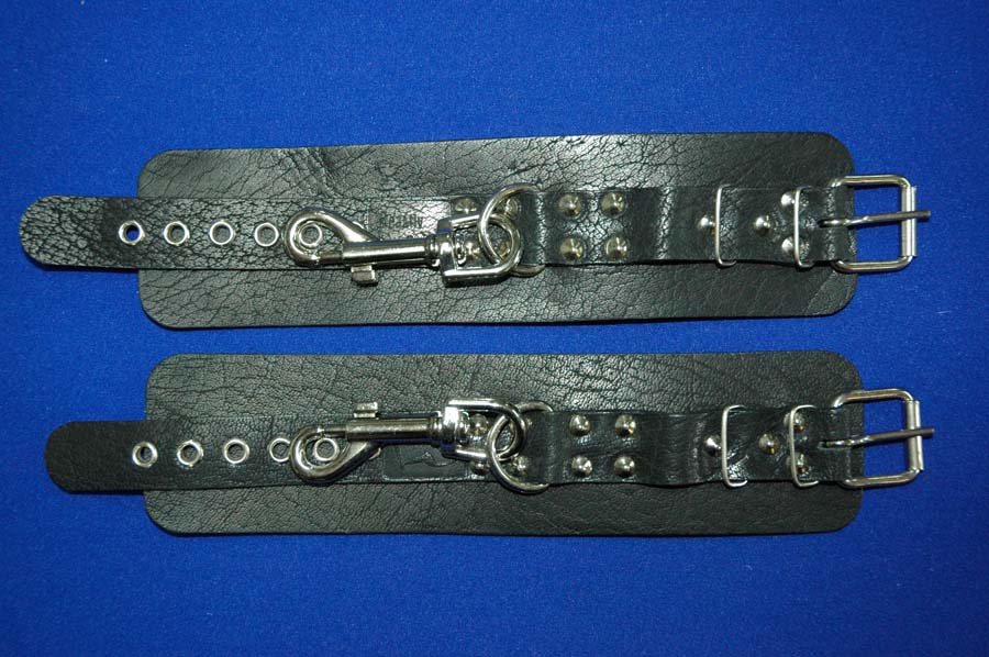Наручники не подшитые, с фиксирующими карабинами. Прямоугольная база, с центральным ремнем поверх базы. По центру наручников сварное D-кольцо, зафиксированное хольнитенами. Застежка, с регулирующим размер ремешком и пряжкой, проходит поверх базы. Наручники подойдут для запястья с обхватом от 14 до 22 см.