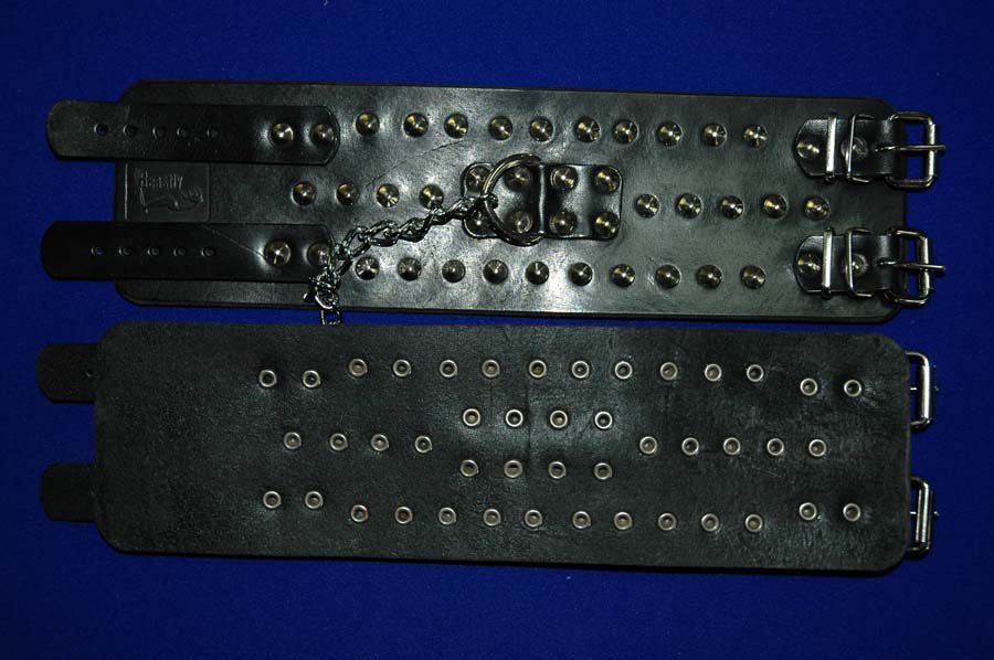 Наножники не подшитые, декорированные металлической фурнитурой, с фиксирующей цепочкой, со сварным D-кольцом, зафиксированным полосой и хольнитенами. Застежка 2 ремешка с пряжками. Длина фиксирующей цепочки - 14 см.