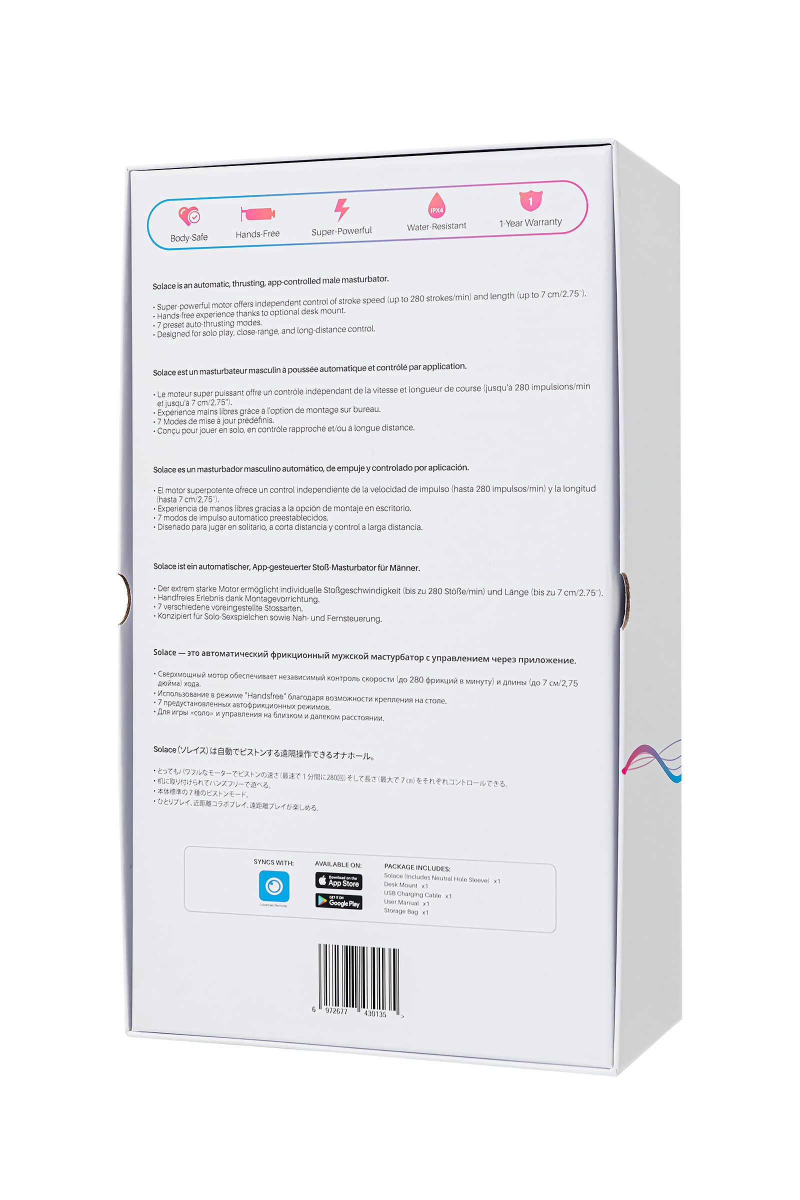 Вы готовы возвести вашу мастурбацию на новый уровень? Solace от Lovense – инновационный автоматический фрикционный мужской мастурбатор, который сделает “это” за тебя. Для этой игрушки не важен опыт и наличие партнера – соло игра, секс с партнером на расстоянии или виртуальная реальность – возможно все! С этой умной игрушкой у вас есть возможность настроить мастурбацию в зависимости от настроения, предпочтений и ситуации. От чувственной и неторопливой, до интенсивной и агрессивной.