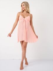 Классическая сорочка babydoll, плиссированная, из шифона, с трусиками-стринг, отрезная под грудью, чашки плотные, украшены кружевом, бретели регулируемые, спинка украшена кружевной вставкой. В комплекте: сорочка, трусики-стринги.