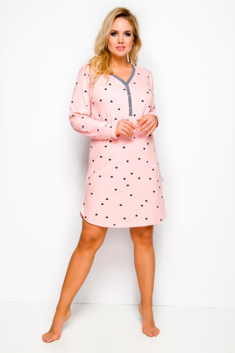 Молодежная женская ночная сорочка Tamara из высококачественного хлопка. Сорочка с V-образным вырезом горловины и планкой на кнопках, с длинным рукавом и принтом сердечки .
