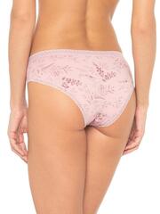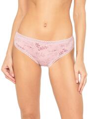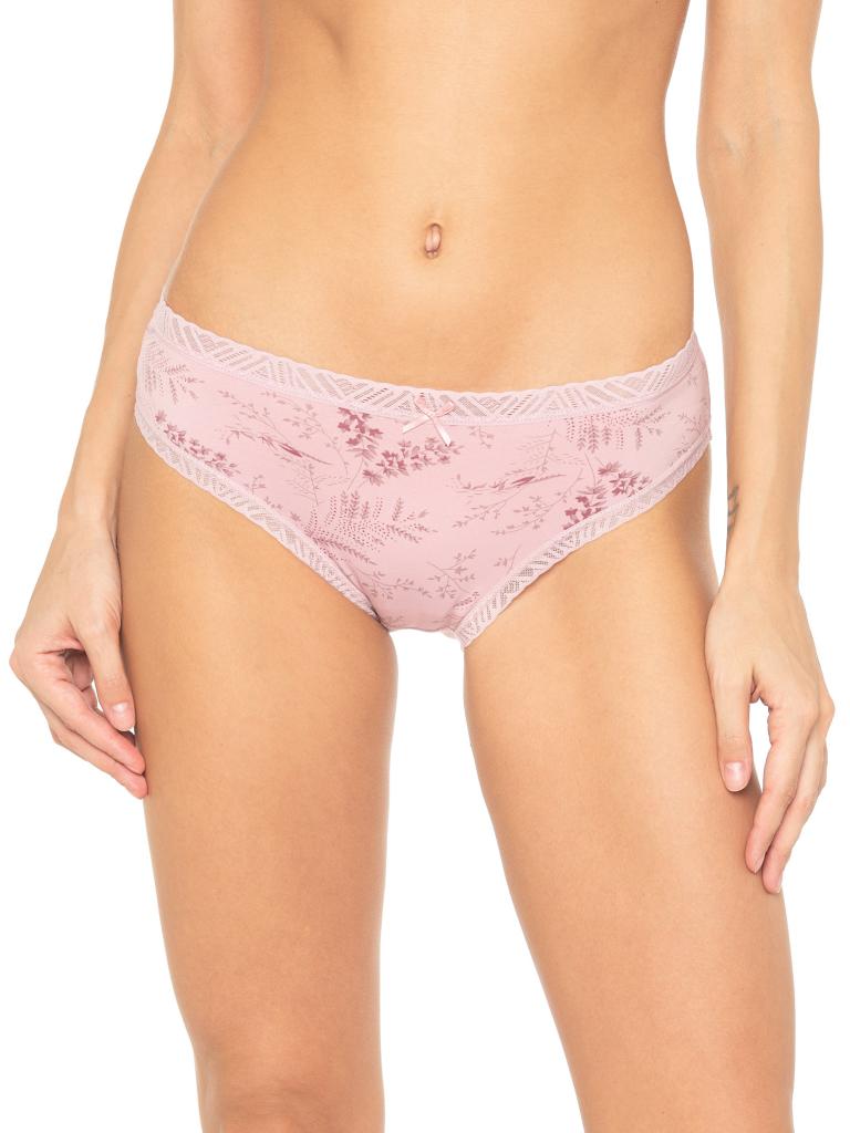 Трусы со средней линией талии, выполнены из деликатного принтованного хлопка со спандексом. Принт с изображением растений. Вырез ножки и талия отделаны широкой кружевной резинкой в цвет изделия. Декор - атласный бантик. Хлопковая ластовица.