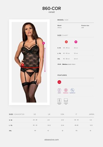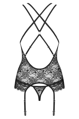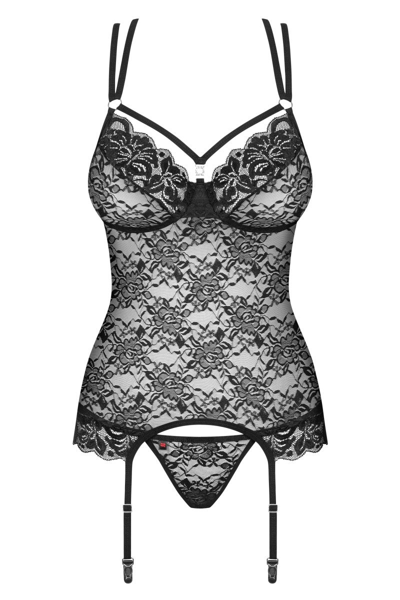 Женственный корсаж из кружева с цветочным мотивом. Мягкие чашечки на косточках украшены сверкающим украшением. Эластичные ремешки над грудью соединяются с бретелями при помощи колец. Сзади регулируемые бретели эффектно переплетаются между собой, обнажая спину. Пажи для чулок также регулируются по длине, не отстегиваются. В комплекте: корсаж, трусики-стринги.