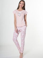 Трикотажный комплект с брюками, ткань в рисунок, футболка с коротким рукавом и с принтом впереди. В комплекте: футболка, брюки.