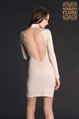 Сорочка из тончайшего материала как вторая кожа. С открытой спиной и застежками на шее. Имеет длинные рукава. Достигает своей гипер-сексуальности за счет игры прозрачности материалов, совмещая два вида. Коробка в стиле французского шика плюс каждая деталь завернута в упаковочную бумагу с логотипами.