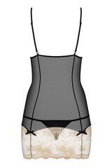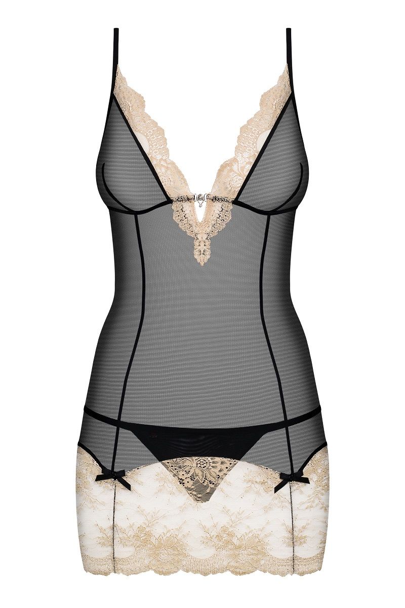 Черная полупрозрачная сорочка на тонких бретелях с контрастной отделкой, линия декольте украшена кружевом и стразами. В комплект входят трусики. В комплекте: сорочка, трусики-стринг.