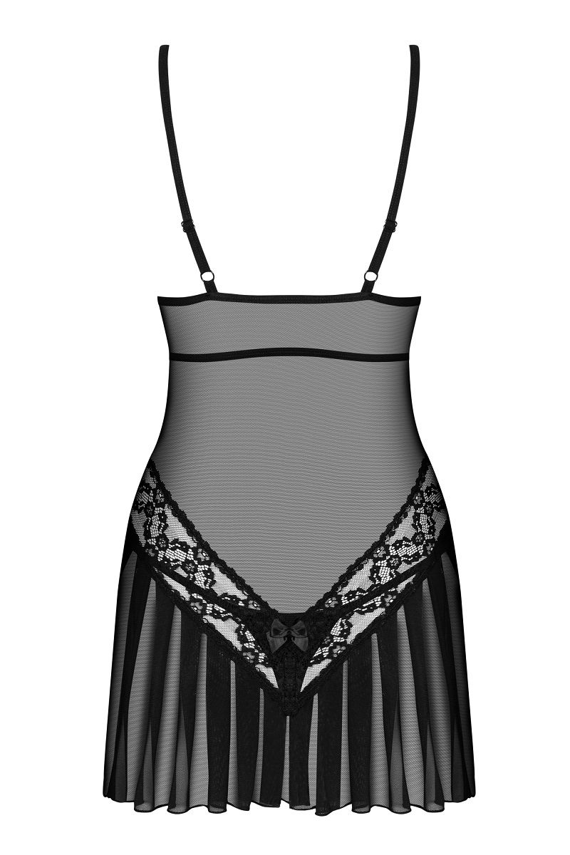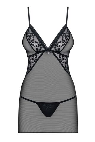 Облегающая сорочка с рюшами на лифе и ниже спинки. В комплекте: сорочка, трусики-стринги.