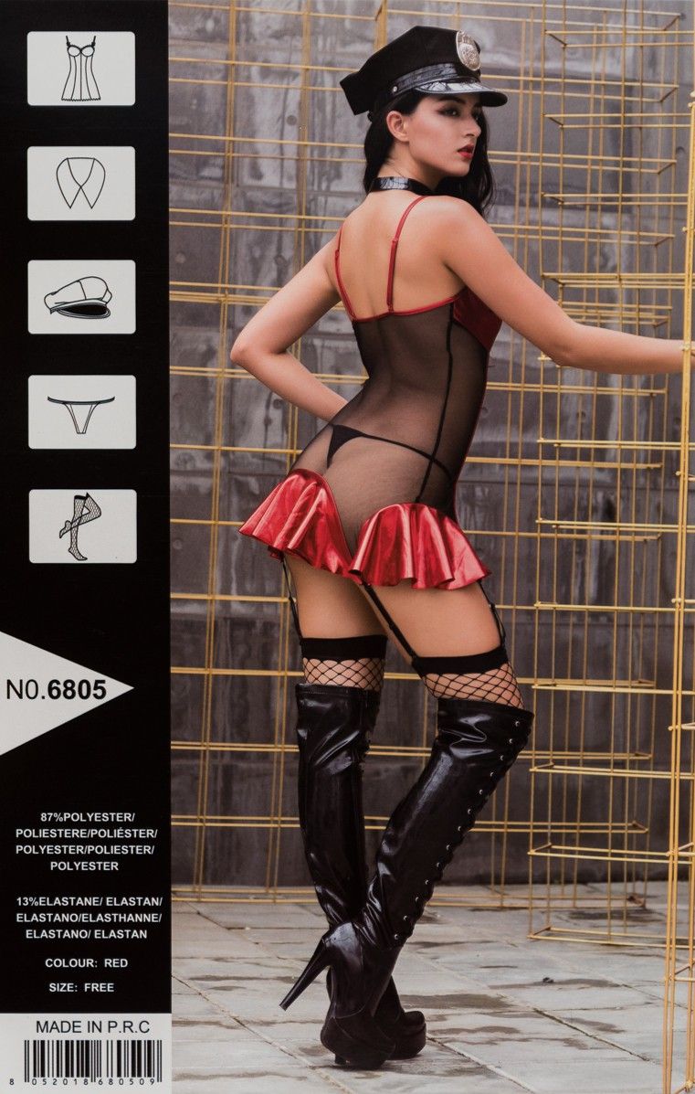 Проведите задержание нарушителя вашего спокойствия! В таком костюме полицейского – сопротивляться он явно не станет. Платье с сеточкой, сделает девушку сверхаппетитной. Костюм полицейского, состоит из платья из комбинированного материала: сетки и виниловых вставок. На подоле платья имеются пажи для чулок (входят в комплект). В комплекте: платье, кепка, воротничок, трусики-стринги и чулки.