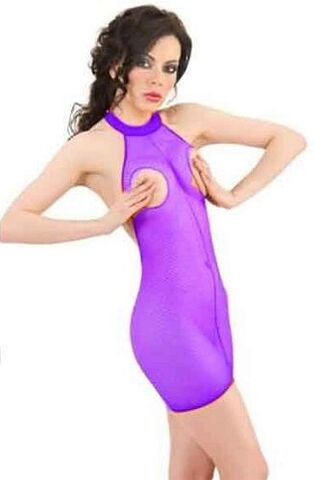 Обтягивающее мини-платье из полупрозрачной ткани, с вырезами в районе груди.