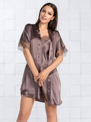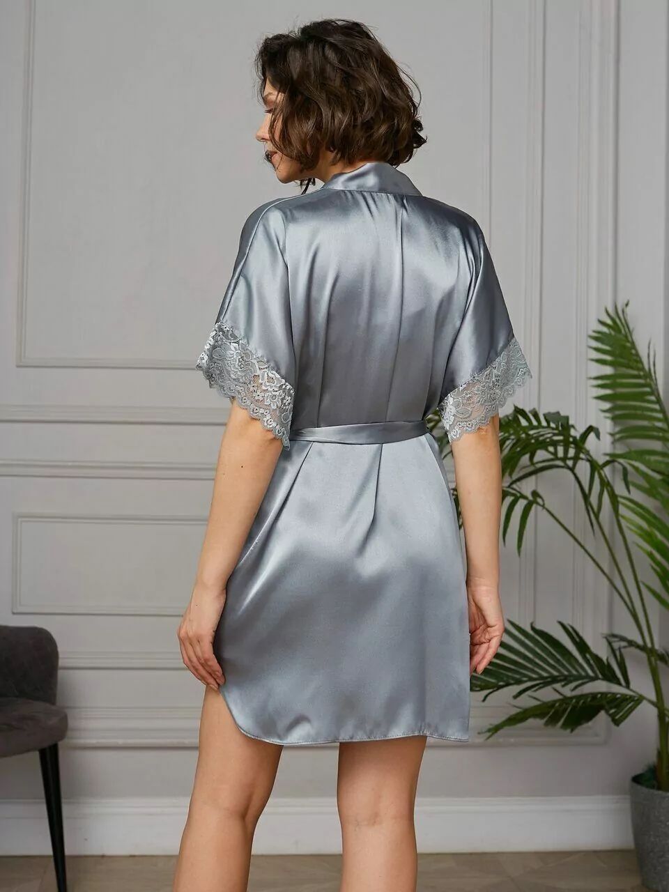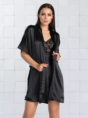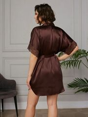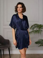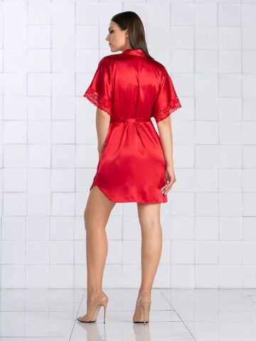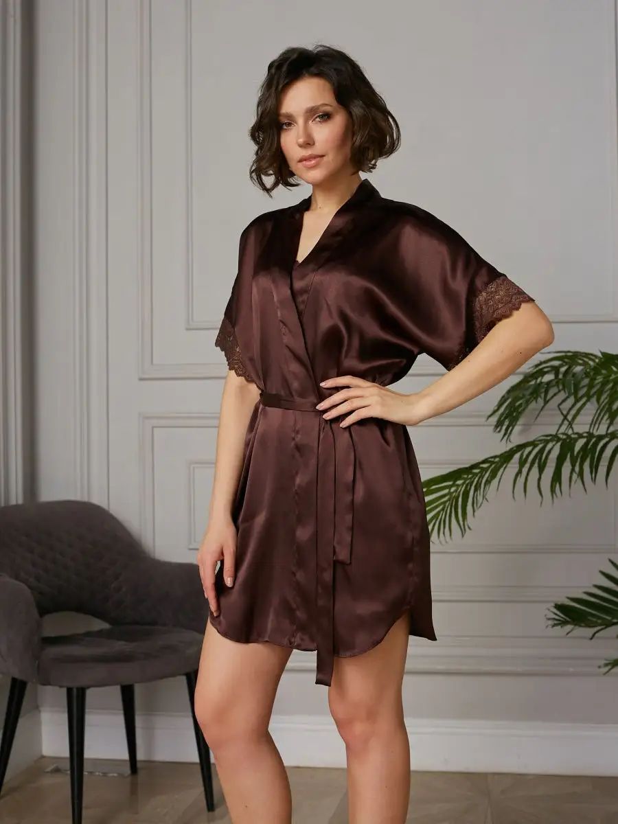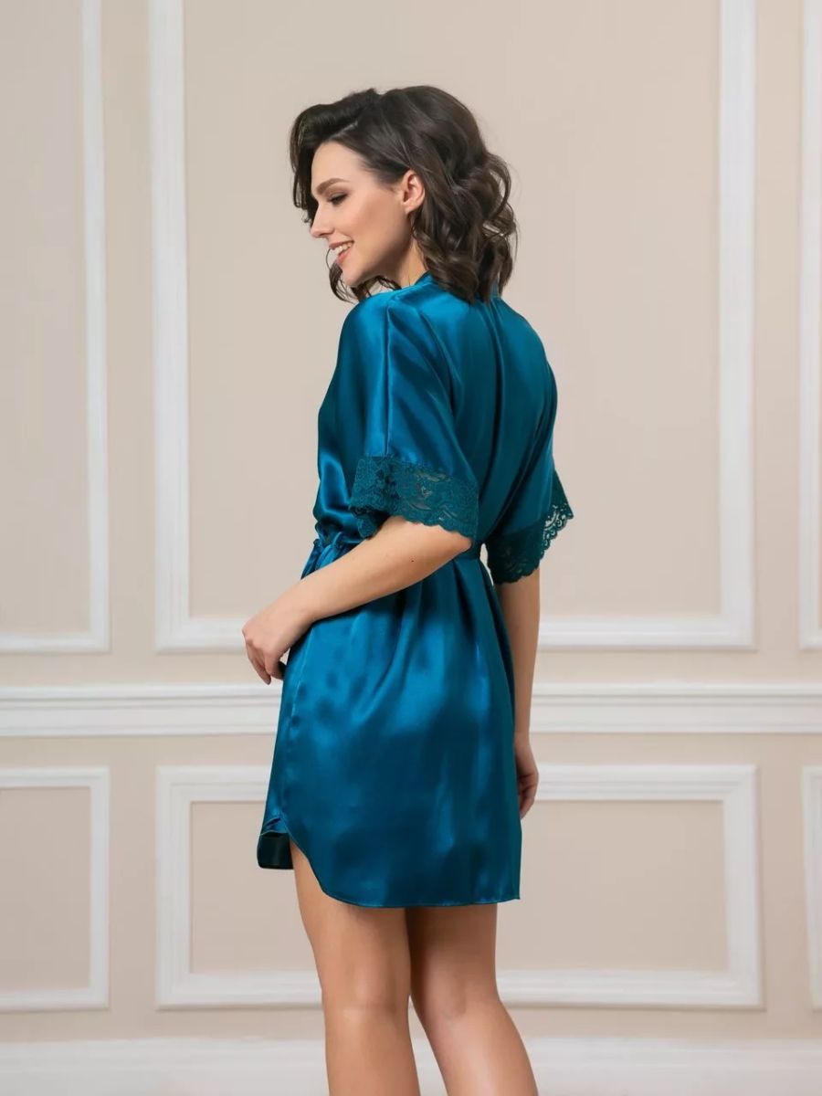 Короткий халат на запах из искусственного шелка с поясом, декорированный кружевом по рукаву.