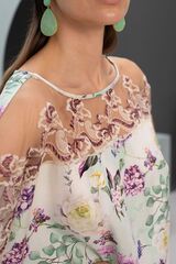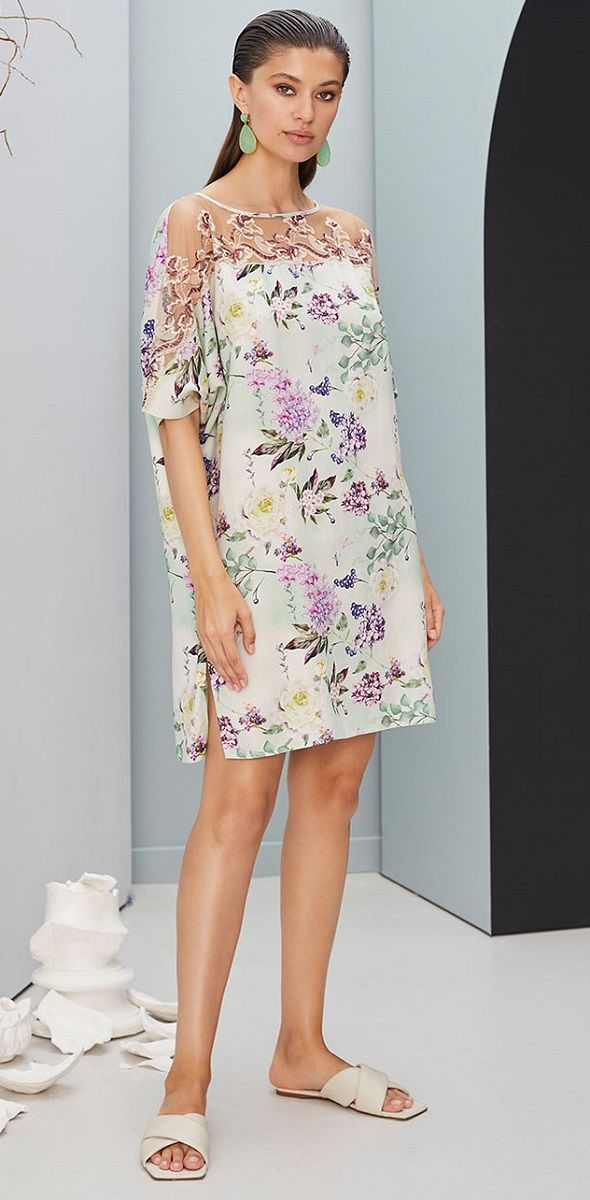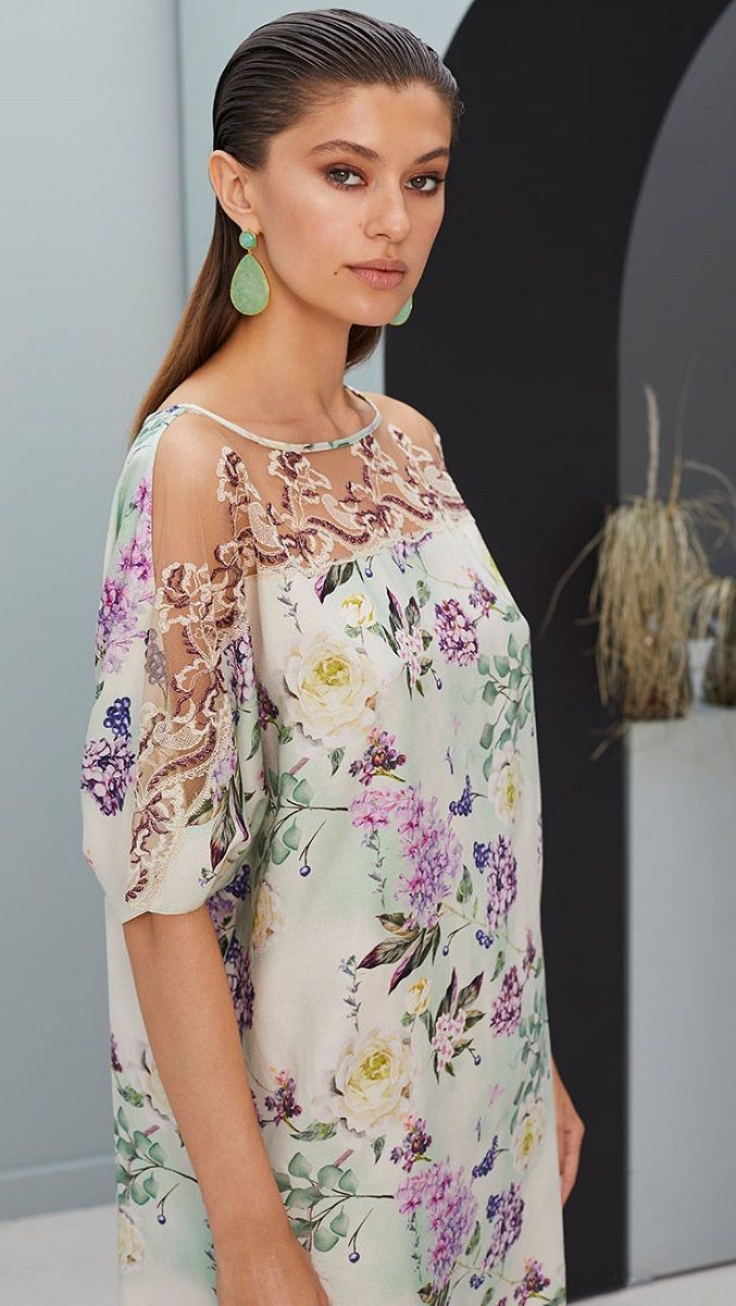 Очаровательная сорочка из ткани высочайшего качества. Вырез сорочки украшен вышитым кружевом, элегантно переходящими в прозрачные вставки на плечах. Сорочка прямого кроя, свободного силуэта. Легкое и элегантное изделие, отличная модель для домашнего гардероба.