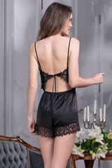 Игривый комбидресс на тонких бретелях с фигурным вырезом на спине, выполнен из смесового однотонного шелка. Вырез полочки, спинки и низ шорт обработаны французским кружевом, которое инкрустировано кристаллами Swarovski. Декор - атласный бантик с искрящейся подвеской, расположенный по центру выреза.