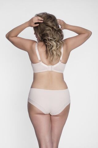Бюстгальтер на косточках, с боковыми поддержками, чашки шитые, из микрофибры - двойная верхняя часть. Бретельки пришиты, регулируются по длине, на спине застёжка - удлинитель на крючках. Между чашек пришит атласный бантик или бантик с подвеской из желтого металла в зависимости от поставки. Новое конструктивное решение - слайдер в форме «сердца», выполняет не только соединительную функцию бретели с основой бюстгальтера, также является направляющей для правильного расположения бретелей, чтобы они не спадали с плеч.