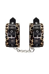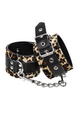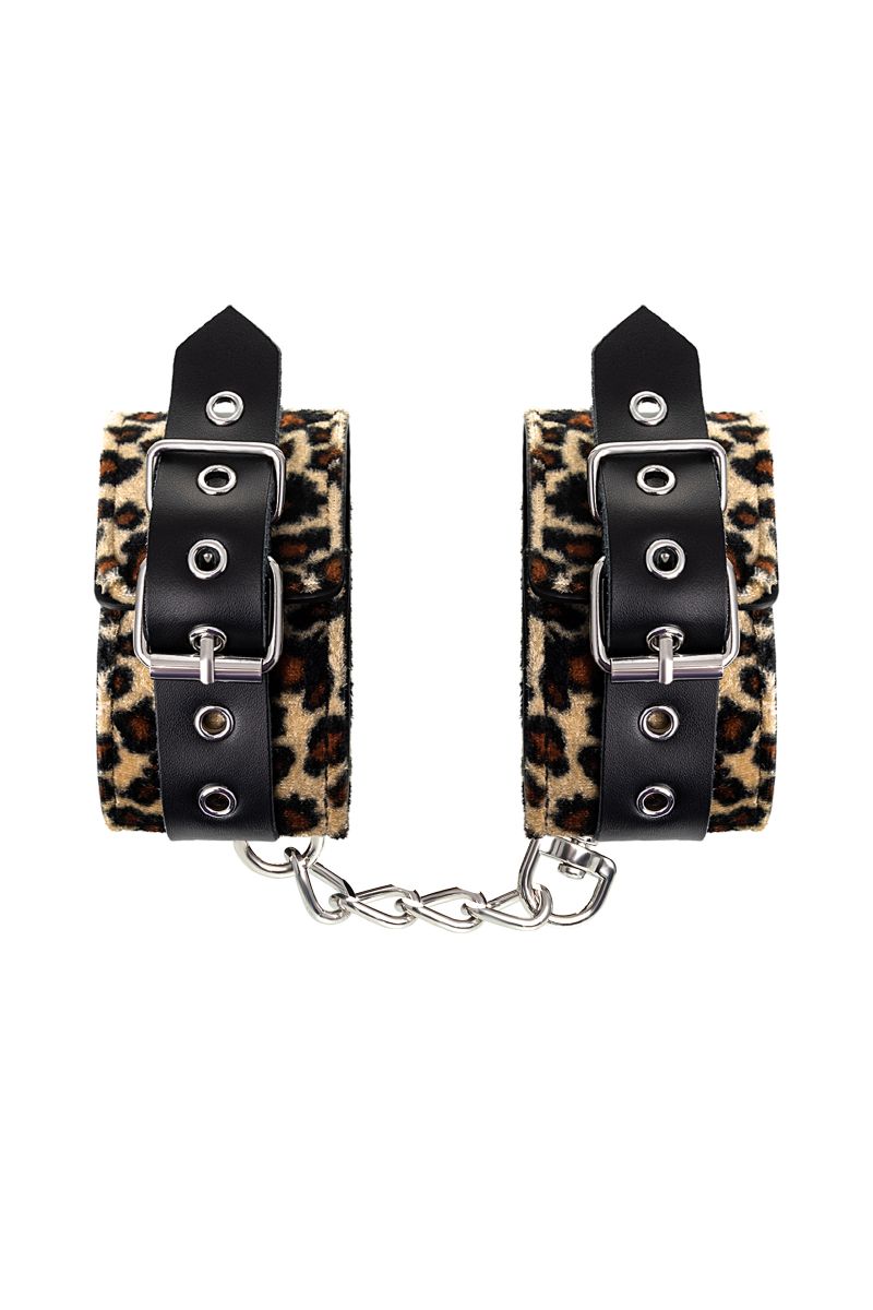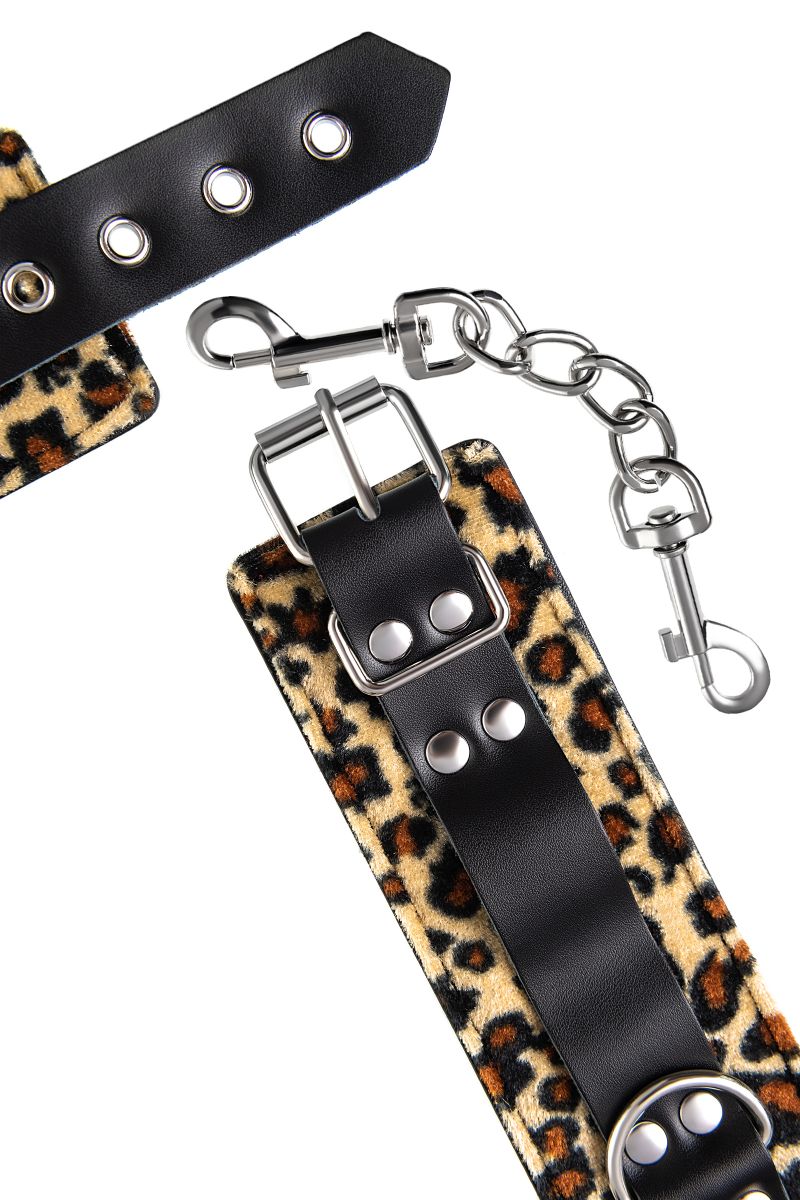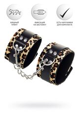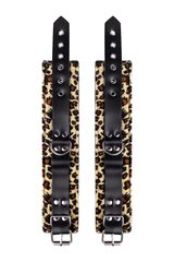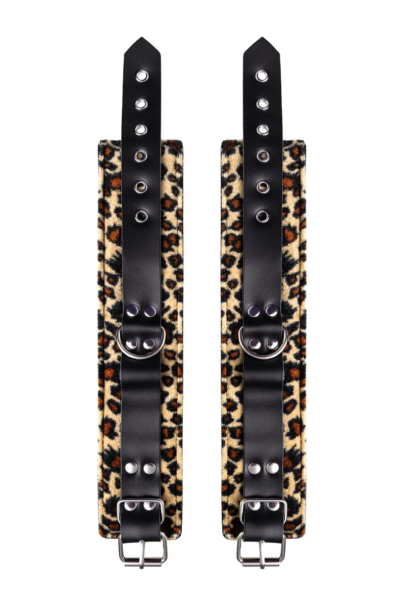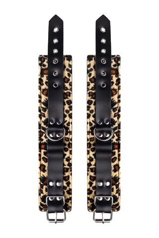 Изготавливаются из кожи с велюровой подкладкой. При изготовлении использована фурнитура с никелевым покрытием. Между слоем основы и подкладкой проложена мягкая прокладка. Соединяются между собой коротким ремешком с двумя карабинами на концах. Не нарушают кровообращение, надёжно фиксируются на щиколотках. Эти яркие оковы с леопардовым принтом сделают подчиненного неотразимым. Леопардовый окрас демонстрирует агрессивный вид. Все звериное нутро, страсть и свобода призывают действовать.