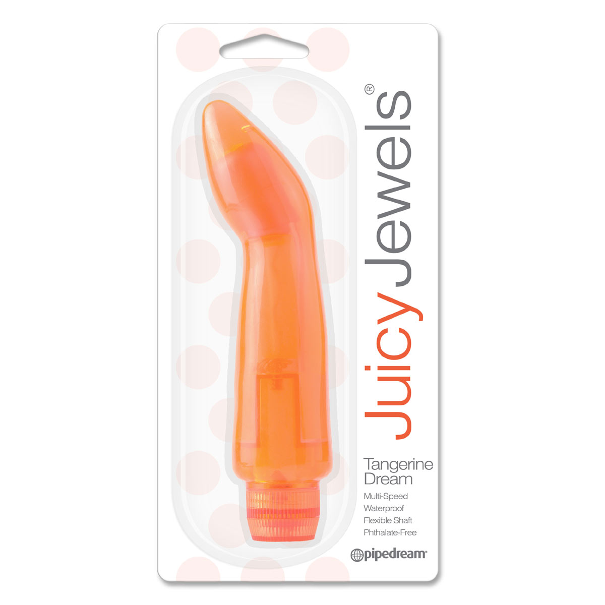Вибратор, оранжевого цвета, с загнутым концом. Имеет плавную регулировку степени вибрации в основании.
