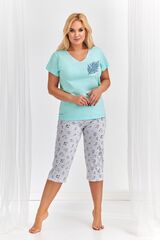 Хлопковая пижама Donata для дам с пышными формами состоит из футболки и принтованных бридж. Футболка свободного кроя, с коротким рукавом и V-образным вырезом горловины. Бриджи на широкой мягкой резинке. Пижама идеально подходит для сна и в качестве домашнего костюма. В комплекте: футболка, бриджи.