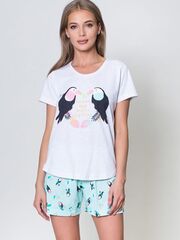 Трикотажный комплект. Футболка из однотонной ткани с коротким рукавом, впереди с принтом, шорты прямого покроя с рисунком. В комплекте: футболка, шорты.