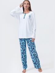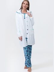Комплект из трех изделий. Халат из однотонной ткани из микрофибры на пуговицах с отложным воротником и карманами. Свитшот из однотонной ткани с принтом, брюки прямого покроя из ткани в рисунок. В комплекте: халат, свитшот, брюки.