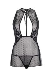 Комплект белья BACKLESS BABYDOLL & STRING. В комплект входит полупрозрачный беби-долл с открытой грудью, который завязывается на шее атласными лентами. По бокам отделан кружевом. Плюс прозрачные трусики-стринги. В комплекте: сорочка, трусики-стринги.