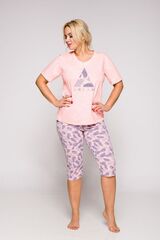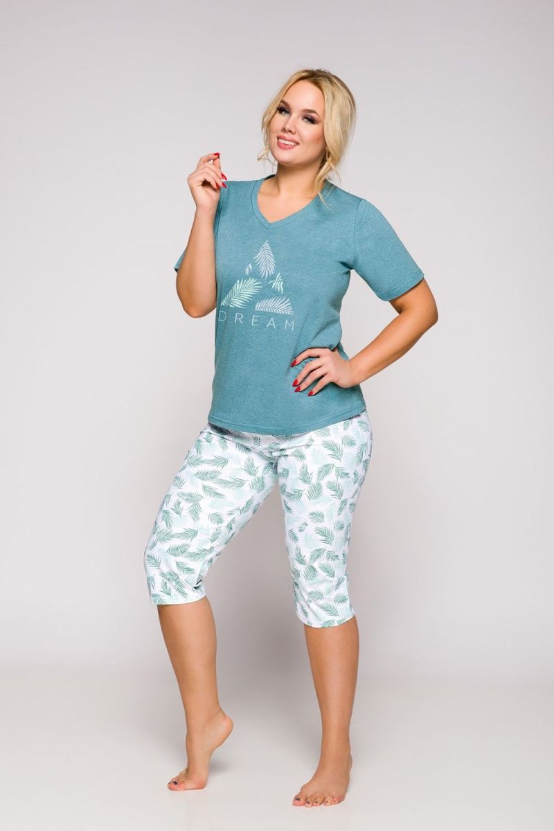 Женская пижама Eliza состоит из футболки и принтованных бридж. Футболка с коротким рукавом и V-образным вырезом горловины. В комплекте: футболка, бриджи.