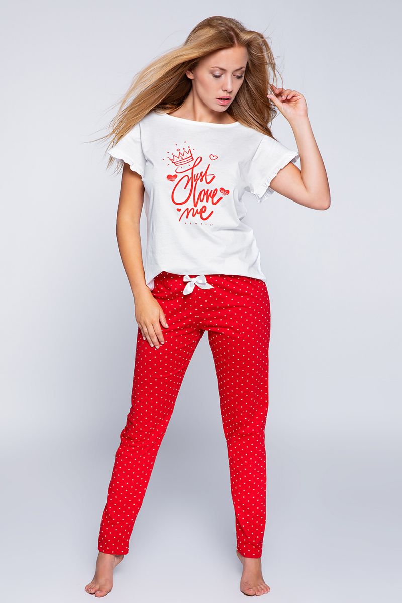Хлопковая пижама Maddy состоит из футболки и брюк. Футболка свободного кроя, с коротким рукавом, на груди принт в виде надписи. Брюки в мелкий горошек, на мягкой резинке. В комплекте: футболка, брюки.