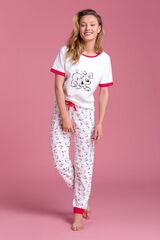 Хлопковая пижама состоит из штанов и футболки. Штаны на завязке, с манжетой-резинкой по низу. Футболка свободного кроя с коротким рукавом, круглым вырезом горловины. Пижама с принтом в виде собачек. Отличный вариант для сна и домашнего отдыха. В комплекте: футболка, брюки.