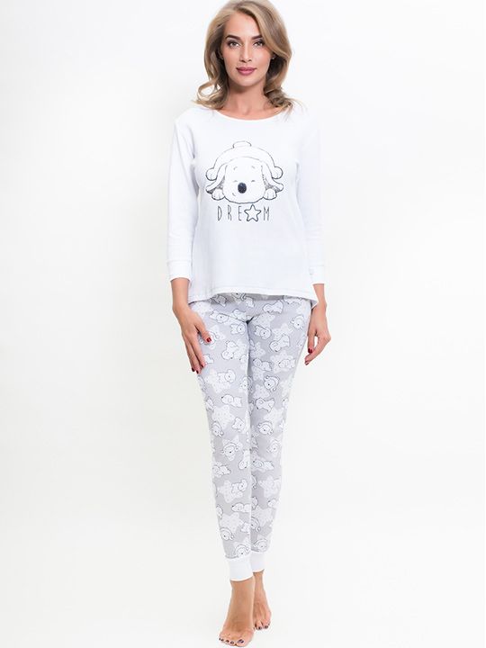 Трикотажный женский комплект. Футболка с длинным рукавом, однотонная, впереди с принтом, лосины на манжете с рисунком. В комплекте: футболка, лосины.
