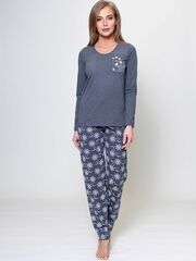 Трикотажный комплект. Футболка с длинным рукавом, однотонная, впереди с принтом, брюки прямого покроя внизу на манжете с рисунком. В комплекте: футболка, брюки.