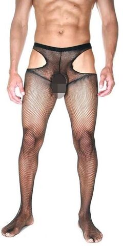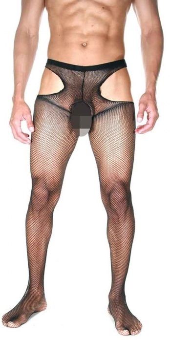 Мужские колготы в мелкую сеточку. На колготах есть вырезы в интимной зоне, на бедрах и на ягодицах. Ткань, из которой изготовлены колготы, отлично тянется и не будет доставлять никакого дискомфорта.