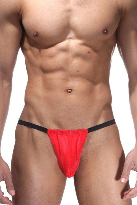 Эротические трусы на тонких черных резинках, с ярко-красным гульфиком-мешочком. Ягодицы полностью открыты.