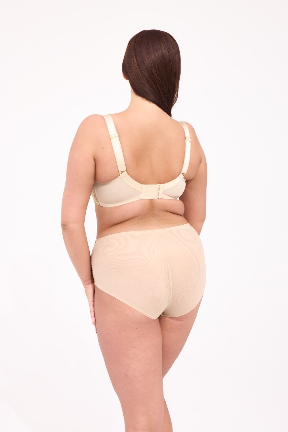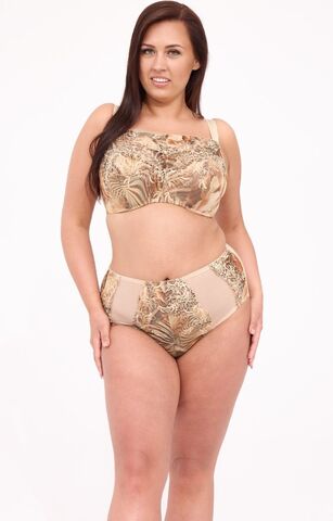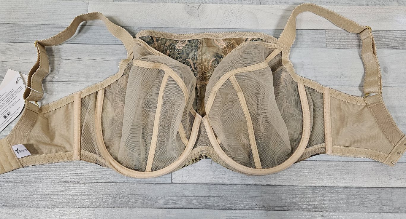 Бюст-топ мягкий, на косточках, с дополнительными боковыми поддержками, чашки шитые из телесной сетки, снаружи из эластичной сетки с принтом, декорированы вышивкой телесной нитью и люрексом, пояс из стабилизирующей сетки, бретельки пришиты, регулируются по длине, на спине застёжка-удлинитель, фурнитура металлическая цвета желтого золота.