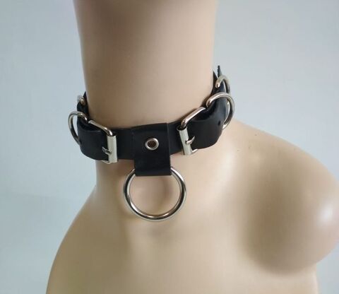 Чокер сделан из мягкой натуральной черной кожи. Декорирован четырьмя металлическими полукольцами и одним большим металлическим кольцом. Впереди две пряжки позволяют подобрать нужный размер и чувствовать себя максимально комфортно. Подойдет на обхват от 35 до 53 см. Интересный дизайн, мягкая кожа, металлические элементы – всё что нужно для отличного образа. Диаметр кольца - 3,5 см.