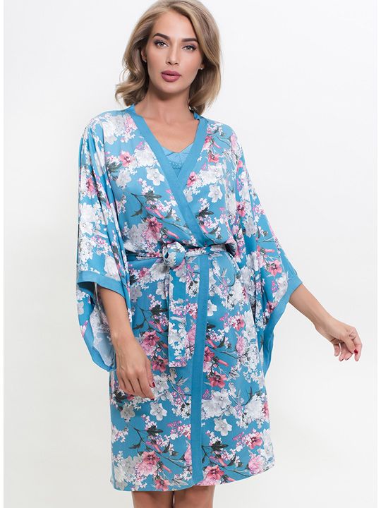 Комплект - халат с сорочкой. Халат в цветочную расцветку, с широкими рукавами, на запахе с поясом. Сорочка на регулируемых бретельках. В комплекте: халат, сорочка.