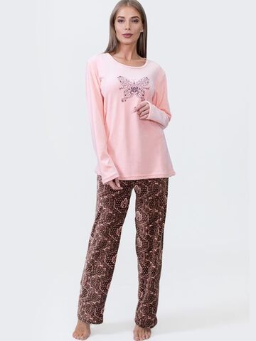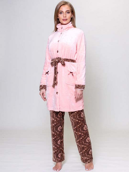 Комплект из трех изделий. Халат из однотонной ткани из микрофибры на пуговицах с отложным воротником и карманами. Свитшот из однотонной ткани с принтом, брюки прямого покроя из ткани в рисунок В комплекте: халат, свитшот, брюки.